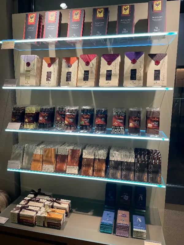 다양한 종류의 초콜릿 바와 깔끔하게 포장된 초콜릿 상자는 선물용으로 안성맞춤입니다. 특히 여러 개를 구매하면 할인해주는 행사도 진행하고 있어, 부담 없이 선물을 구입할 수 있습니다. 가게는 작지만 선물 종류는 다양하며, 직원들은 모든 것을 자세히 설명하며 단계별로 안내해 줍니다. 일부 품목에는 알코올이 포함되어 있으니, 선물을 고를 때 참고하는 것이 좋습니다. 가격은 다소 높은 편이지만, 선물은 고급스럽고 포장도 독특하여 그 가치를 충분히 합니다.