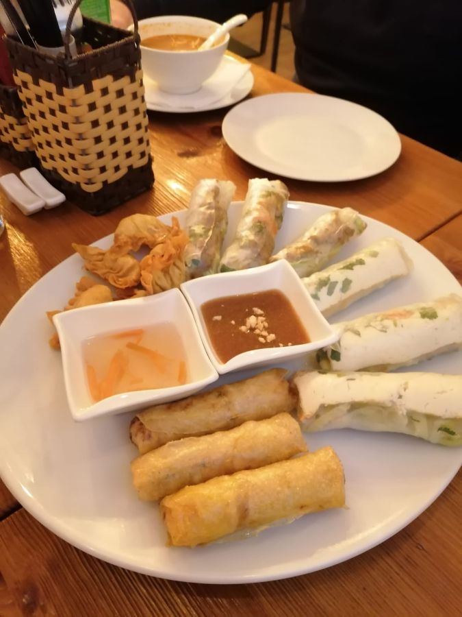 땅콩 소스에 콕 찍어 한 입 베어 무니, 바삭한 껍질과 촉촉한 속 재료가 환상적인 조화를 이루었다. 새우의 탱글탱글한 식감과 신선한 야채의 아삭함이 입안 가득 느껴졌다. 춘권 한 입, 맥주 한 모금. 이 완벽한 조합은 입맛을 돋우기에 충분했다.