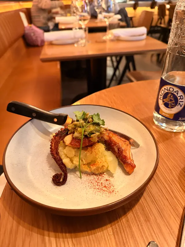 저희를 담당해주신 서버분은 정말 친절하고 세심했습니다. 음료도 훌륭했지만, 단연 최고의 메뉴는 문어 요리였습니다. 겉은 살짝 바삭하면서 속은 부드러운 문어는 입안에서 살살 녹았습니다. 사진에서 보이는 것처럼, 잘 구워진 문어 다리 위에는 신선한 허브와 소스가 곁들여져 있어 풍미를 더했습니다. 올리브 오일의 향긋함과 레몬즙의 상큼함이 어우러져 문어의 감칠맛을 더욱 돋보이게 했습니다. 문어의 쫄깃한 식감과 섬세한 맛은 정말 잊을 수 없었습니다.