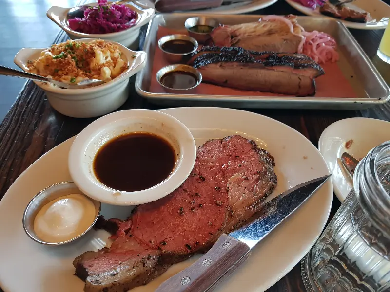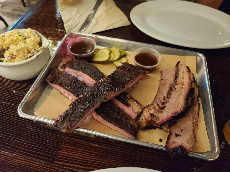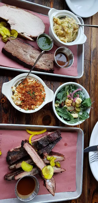 풍성한 플래터 구성. 립, 브리스킷, 코울슬로, 맥앤치즈 등 다채로운 맛의 향연!