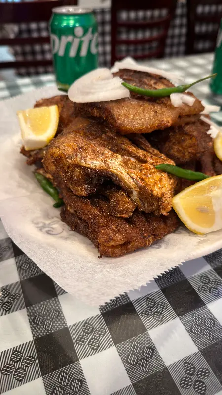 윤기가 자르르 흐르는 튀김 요리, 레몬과 양파의 조화가 식욕을 자극한다.
