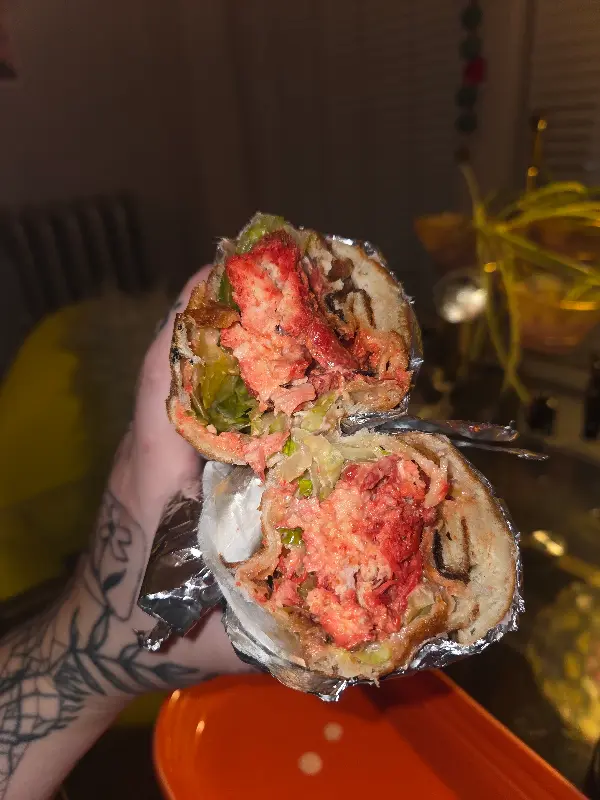 탄두리 치킨 랩의 단면, 신선한 채소와 붉은 치킨의 조화가 인상적이다.