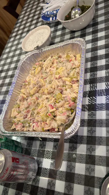 다양한 채소와 면이 어우러진 샐러드, 신선함이 느껴진다.