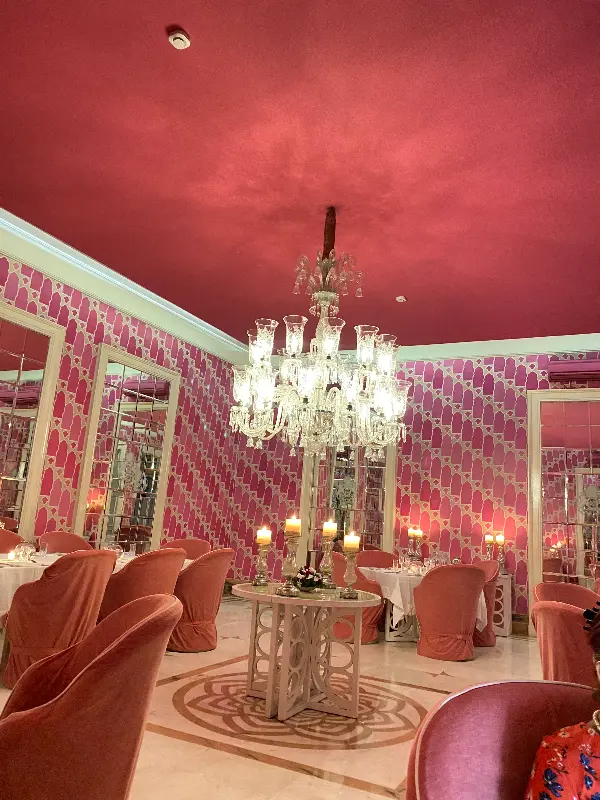 레스토랑 내부는 핑크빛으로 물들어 있었다. 천장부터 벽지, 의자까지 온통 핑크색의 향연이었지만, 촌스럽거나 과하다는 느낌은 전혀 없었다. 오히려 샹들리에의 은은한 빛과 어우러져 몽환적이면서도 고급스러운 분위기를 자아냈다. 사진에서 볼 수 있듯이, 마치 동화 속 공간에 들어온 듯한 기분이었다. 벽면에는 독특한 문양이 반복적으로 새겨져 있어 시각적인 즐거움을 더했고, 곳곳에 놓인 거울은 공간을 더욱 넓어 보이게 하는 효과를 주었다.