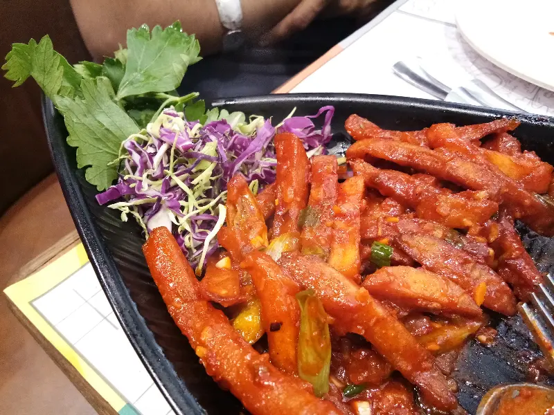 우리는 야채 크리스피와 감자 크리스피도 주문했습니다. 바삭하게 튀겨진 야채와 감자는 함께 제공되는 소스와 환상적인 궁합을 자랑했습니다. 메인 코스로는 베지 엑조티카 시즐러를 먹었는데, 푸짐한 양에 놀랐습니다. 따뜻하게 제공되는 시즐러는 다양한 야채와 소스가 어우러져 풍성한 맛을 선사했습니다. 이미지 1을 보면, 붉은 양념에 버무려진 감자튀김과 신선한 야채 샐러드가 조화롭게 담겨 있는 것을 확인할 수 있습니다. 이처럼 Say Cheese는 맛뿐만 아니라 비주얼적으로도 훌륭한 음식을 제공합니다.