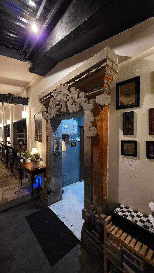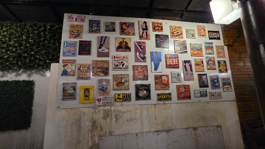 특히 벽면을 가득 채운 빈티지 포스터와 그림들은 멜리스 가든만의 개성을 잘 보여줍니다. 다양한 문구와 그림이 담긴 이 작품들은 마치 갤러리에 온 듯한 착각을 불러일으키며, 보는 즐거움을 더합니다. 또한, 내부로 들어서는 문은 인도네시아 전통 양식으로 조각되어 있어 이국적인 분위기를 한층 더 강조합니다.