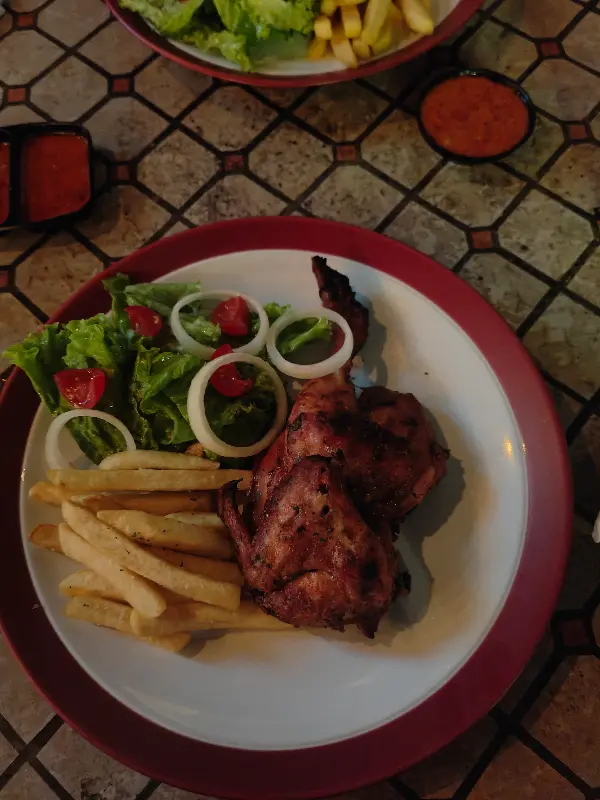 선택의 폭이 넓지 않았지만, ‘구운 피리피리 치킨’은 훌륭한 선택이었습니다. 겉은 바삭하고 속은 촉촉한 닭고기는 매콤한 피리피리 소스와 완벽하게 어우러져 입맛을 돋웁니다. 닭고기 한 점을 입에 넣는 순간, 매콤한 향이 코를 간지럽히고, 곧이어 입 안 가득 퍼지는 풍미는 미각을 자극합니다.