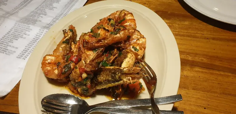 혼자 방문했기에 추천을 받아 새우 요리와 밥을 주문했는데, 소스가 정말 기가 막혔습니다. 지금까지 먹었던 새우 요리 중 단연 최고라고 할 수 있을 정도로 훌륭했습니다. 짭짤하면서도 달콤하고, 매콤한 맛이 어우러진 소스는 새우의 탱글탱글한 식감과 완벽하게 조화를 이루었습니다. 밥에 소스를 비벼 먹으니 순식간에 한 그릇을 비울 수 있었습니다.