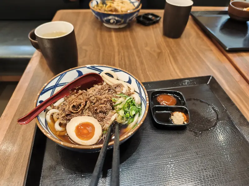 마루가메 우동의 또 다른 매력은 바로 무료 토핑입니다. 테이블 한 켠에는 양파, 소스, 빵가루 등 다양한 토핑들이 준비되어 있어 취향에 따라 우동에 넣어 먹을 수 있습니다. 저는 소고기 우동에 양파와 빵가루를 듬뿍 넣어 먹었는데, 아삭아삭한 양파와 바삭바삭한 빵가루가 우동의 맛을 더욱 풍성하게 만들어 주었습니다.