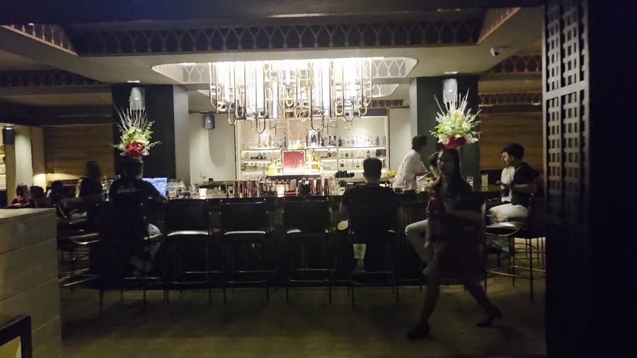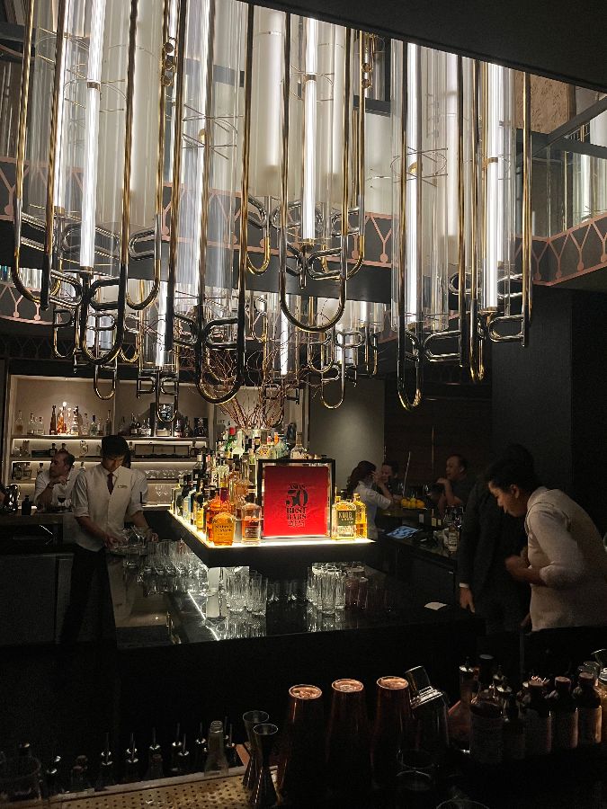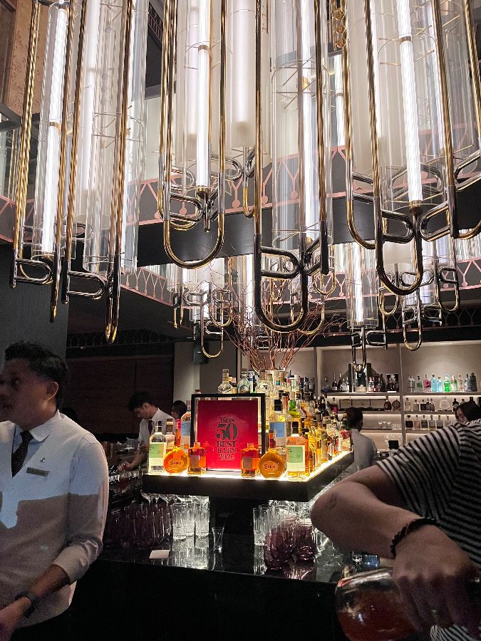 중앙 바 카운터 위로 길게 늘어뜨려진 독특한 형태의 샹들리에는 시선을 사로잡는 하나의 예술 작품입니다. 황금빛으로 빛나는 샹들리에와 그 아래 진열된 다채로운 색깔의 주류병들이 어우러져, 마치 보석 상자를 연상시키는 화려함을 자랑합니다. 이 모든 요소들이 조화를 이루어 세계적인 수준의 우아함을 지닌 바라는 명성을 그대로 보여줍니다.