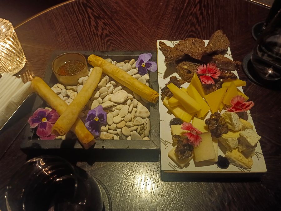 다양한 종류의 치즈, 말린 과일, 견과류, 바삭한 스틱이 예쁘게 플레이팅된 스낵 메뉴입니다. 보라색 꽃으로 장식되어 있어 더욱 먹음직스러워 보입니다.