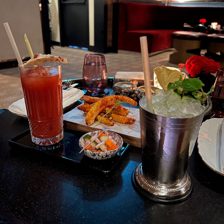 칵테일과 함께 즐기는 스낵 메뉴 또한 세인트 레지스 바의 빼놓을 수 없는 매력입니다. 단순한 안주가 아닌, 칵테일의 맛을 한층 더 끌어올려 주는 완벽한 페어링을 자랑하는 미식 경험을 제공합니다. 따뜻하게 구워낸 듯한 미니 핫도그와 바삭한 나초는 부드러운 칵테일과 환상적인 궁합을 이룹니다.