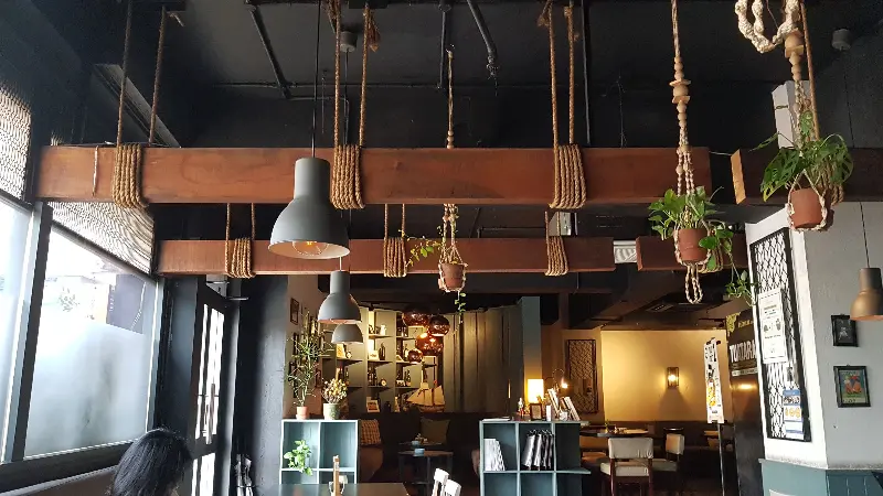 카페 내부는 카우보이 로프에 나무 기둥을 매달아 놓은 듯한 독특한 미국 스타일로 꾸며져 있다. 살짝 어두운 조명 아래, 나무의 질감이 살아있는 인테리어는 편안함과 동시에 세련된 느낌을 준다. 천장에는 밧줄과 나무를 이용한 장식이 늘어져 있고, 곳곳에 놓인 작은 화분들이 공간에 생기를 불어넣는다. 마치 숨겨진 아지트 같은 분위기 덕분에 혼자만의 시간을 보내기에도, 친구들과 담소를 나누기에도 더할 나위 없이 좋다.