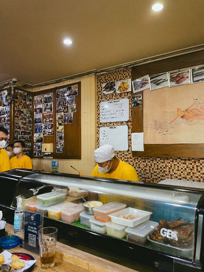 스시 천국은 오랜 시간 자카르타에서 사랑받아 온 일식당이라는 명성에 걸맞게, 그 인테리어에서부터 전통과 역사의 깊이가 느껴집니다. 다소 투박하면서도 정겨운 일본 변두리 선술집의 감성을 고스란히 담고 있는 이곳은, 화려함보다는 편안하고 아늑한 분위기로 손님을 맞이합니다. 벽면 가득 채워진 사진들은 그동안 이곳을 다녀간 수많은 이들의 추억과 이야기를 담고 있는 듯하며, 마치 시간이 멈춘 듯한 착각을 불러일으킵니다. 깔끔하게 정돈된 스시바와 그 뒤로 보이는 신선한 재료들은 음식에 대한 기대감을 더욱 높여줍니다. 특히 평일 저녁에도 손님들로 북적이는 모습을 보면, 방문 전 미리 연락하여 자리를 확보하는 것이 현명한 선택일 것입니다. 이러한 풍경 속에서, 갓 잡은 듯 신선하게 관리된 생선들이 오늘의 주인공이 되기 위해 대기하고 있는 모습은 미식가들의 마음을 설레게 하기에 충분합니다.