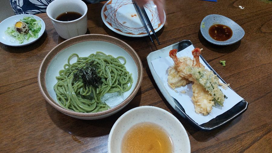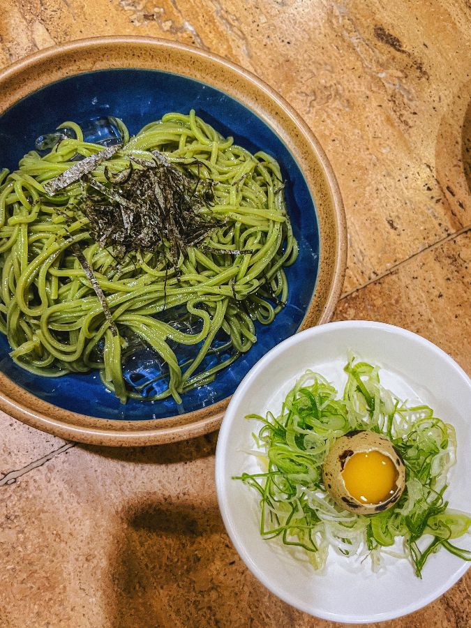 구운 생선 머리 요리는 비주얼부터 시선을 사로잡는 이색적인 메뉴입니다. 노릇하게 구워진 생선 껍질과 촉촉한 속살은 그 자체로 훌륭한 술안주가 됩니다. 특히 담백하면서도 고소한 생선 살은 감칠맛이 뛰어나, 술을 부르는 마성의 매력을 지녔습니다. 곁들여진 레몬 조각을 살짝 뿌리면 상큼한 향이 더해져 풍미가 한층 살아납니다. 또한, 푸릇한 소바는 독특한 비주얼과 함께 시원하고 깔끔한 맛을 선사합니다. 삶은 메추리알과 송송 썰린 대파가 곁들여져 더욱 풍성한 맛을 느낄 수 있습니다. 차가운 소바는 특히 자카르타의 더운 날씨에 제격이며, 입맛을 돋우는 역할을 톡톡히 해냅니다.