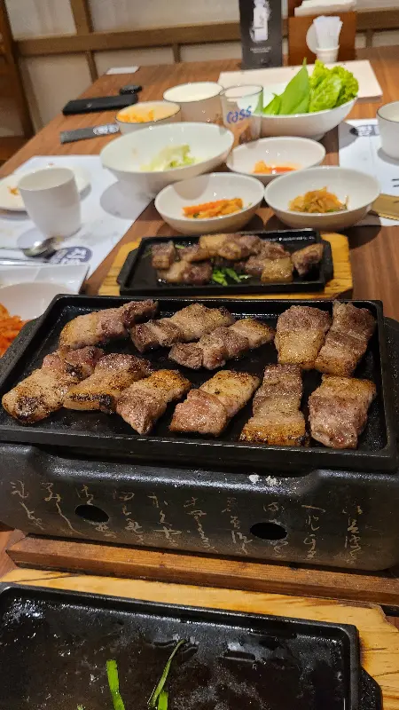 이곳의 대표 메뉴인 생갈비는 초벌되어 나옵니다. 은은한 숯불에 올려 마저 구워 먹으면, 겉은 바삭하고 속은 촉촉한 완벽한 생갈비를 맛볼 수 있습니다. 육즙이 풍부하고 신선한 돼지고기의 풍미는 입안 가득 퍼져 나갑니다. 특히, 함께 제공되는 다양한 쌈 채소와 곁들여 먹으면 더욱 풍성한 맛을 느낄 수 있습니다.