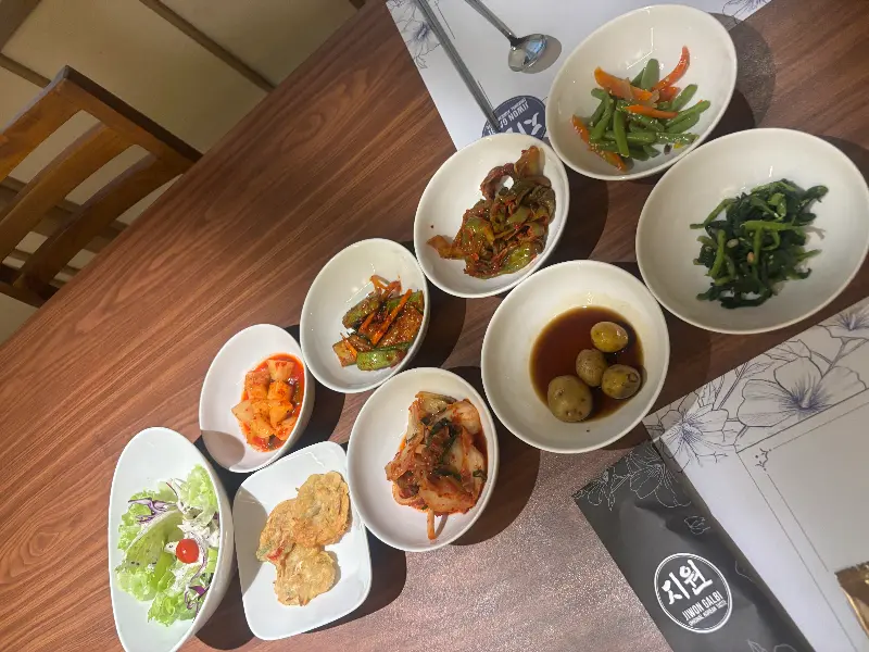 자리에 앉자마자 눈 앞에 펼쳐지는 것은 다채로운 밑반찬의 향연입니다. 김치를 비롯하여 떡볶이, 파김치, 깍두기, 갓김치 등, 한국의 웬만한 식당보다 훌륭하다는 칭찬이 아깝지 않을 정도로 맛깔스러운 반찬들이 가득합니다. 특히, 잘 익은 김치들은 입맛을 돋우는 데 제 역할을 톡톡히 합니다. 신선한 재료와 정성스러운 손맛이 느껴지는 밑반찬들은 메인 메뉴에 대한 기대감을 한껏 높여줍니다.