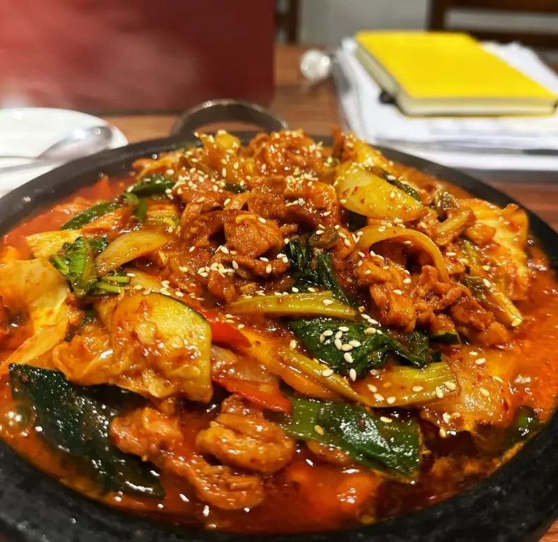 식사 메뉴로는 김치전골과 오리불고기를 추천합니다. 김치전골은 얼큰하고 시원한 국물이 일품이며, 오리불고기는 매콤달콤한 양념이 밥과 환상적인 조화를 이룹니다. 특히, 김치전골은 잘 익은 김치와 푸짐한 재료가 어우러져 깊은 맛을 자랑합니다.