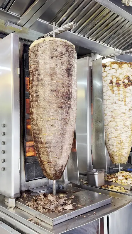 고민 끝에, 추천받은 소고기 샤워마와 치킨 샤워마를 주문했다. 주문을 받는 직원들은 모두 친절했고, 능숙한 솜씨로 샤워마를 만들어내는 모습은 보는 재미를 더했다. 특히, 커다란 기계에 꽂혀 빙글빙글 돌아가는 고기 덩어리는 시선을 사로잡았다.