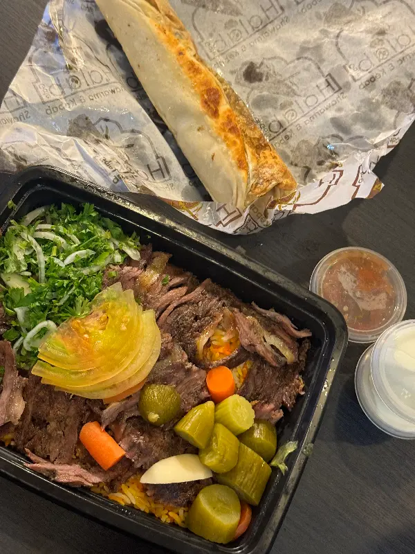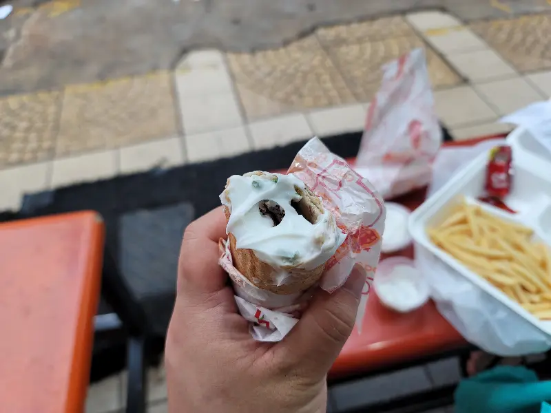 드디어 기다리던 소고기 샤워마가 나왔다. 따뜻한 온기가 손에 느껴졌다. 얇게 펴진 빵 안에 듬뿍 담긴 소고기와 신선한 야채, 그리고 특제 소스가 어우러진 모습은 보기만 해도 군침이 돌았다.