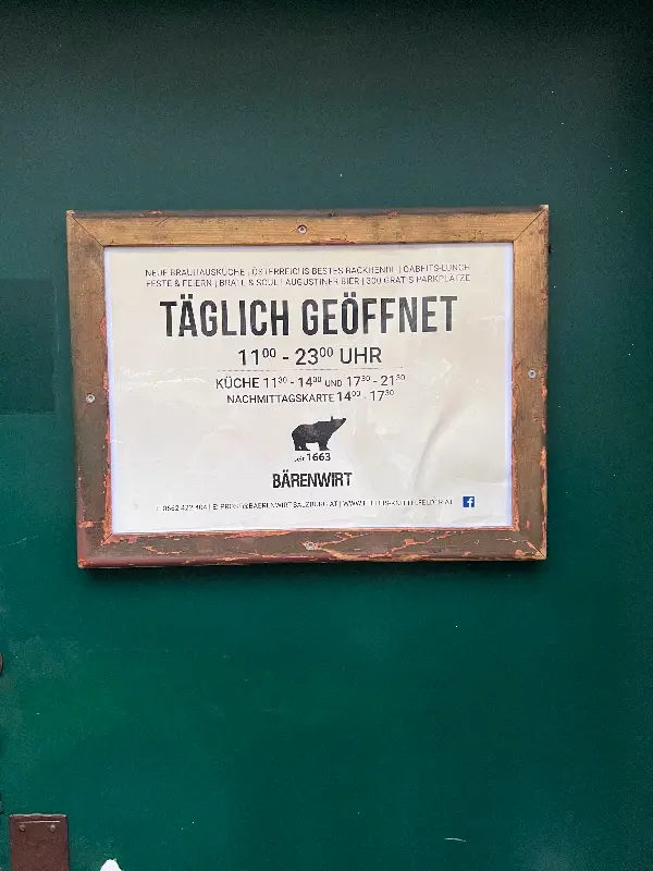Bärenwirt는 단순한 레스토랑이 아닌, 오스트리아의 역사와 문화를 느낄 수 있는 특별한 공간입니다. 고풍스러운 분위기 속에서 맛있는 음식과 친절한 서비스를 경험하며, 잊지 못할 추억을 만들 수 있습니다. 잘츠부르크를 방문하신다면, Bärenwirt에서 오스트리아 음식의 정수를 느껴보시길 바랍니다. 비록 음식 제공 속도나 좌석 배정에 아쉬움이 남을 수 있지만, Bärenwirt가 선사하는 특별한 경험은 그 모든 것을 잊게 해줄 것입니다.