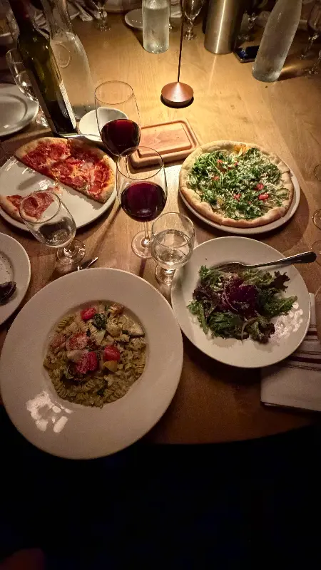 아내가 주문한 해산물 링귀니는 신선한 해산물이 듬뿍 들어있었습니다. 링귀니 면은 탱글탱글하게 잘 삶아져 있었고, 해산물의 풍미가 면에 잘 배어 있었습니다. 특히, 글루텐과 유제품 알레르기가 있는 아내를 위해 특별히 신경 써서 만들어준 점이 감동적이었습니다. 곰돌이 스테이크 샐러드는 신선한 채소와 부드러운 스테이크의 조화가 훌륭했습니다. 기름진 음식을 먹은 후에 먹으니, 입안이 깔끔하게 정리되는 느낌이었습니다. 남편이 주문한 피자는 얇고 바삭한 도우 위에 신선한 토핑이 가득 올려져 있었습니다. 한 입 베어 물자, 입안 가득 퍼지는 풍미가 일품이었죠.