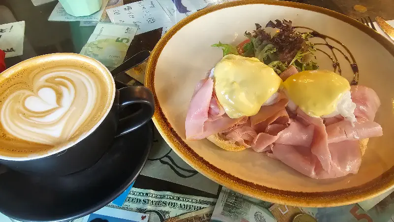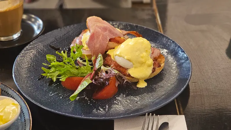 다른 날에는 에그 베네딕트 with 햄을 주문했는데, 부드러운 수란과 짭짤한 햄, 잉글리시 머핀의 조화가 훌륭했다. 특히, 햄의 풍미와 홀랜다이즈 소스의 부드러움이 어우러져 입안에서 황홀한 맛의 향연이 펼쳐졌다. 샐러드도 신선하고 드레싱도 맛있어서, 느끼함 없이 깔끔하게 즐길 수 있었다.