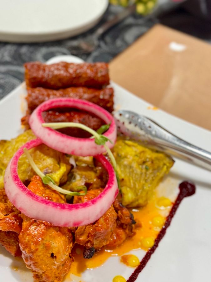 여러 명이 방문한다면, 화덕에 구운 모듬 고기 플래터를 강력 추천합니다. 다양한 종류의 고기를 한 번에 맛볼 수 있어 만족감이 높습니다. 붉은 양념으로 marinated 된 치킨과 소시지 형태의 고기는 각기 다른 맛과 식감을 선사하며, 중간중간 올려진 양파 링과 노란 소스가 고기의 풍미를 더욱 돋보이게 합니다.