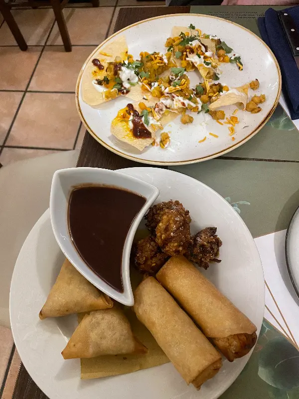 접시 위에 놓인 튀김들은 겉은 바삭하고 속은 촉촉해 보인다. 특히 삼각 모양의 사모사와 길쭉한 롤 형태의 튀김은 인도 요리에서 빼놓을 수 없는 인기 메뉴이다. 짙은 갈색의 소스는 달콤하면서도 매콤한 맛을 더하며, 튀김의 느끼함을 잡아준다. 튀김 위에 뿌려진 하얀색 소스는 요거트 소스일 가능성이 높으며, 상큼한 맛을 더해준다.