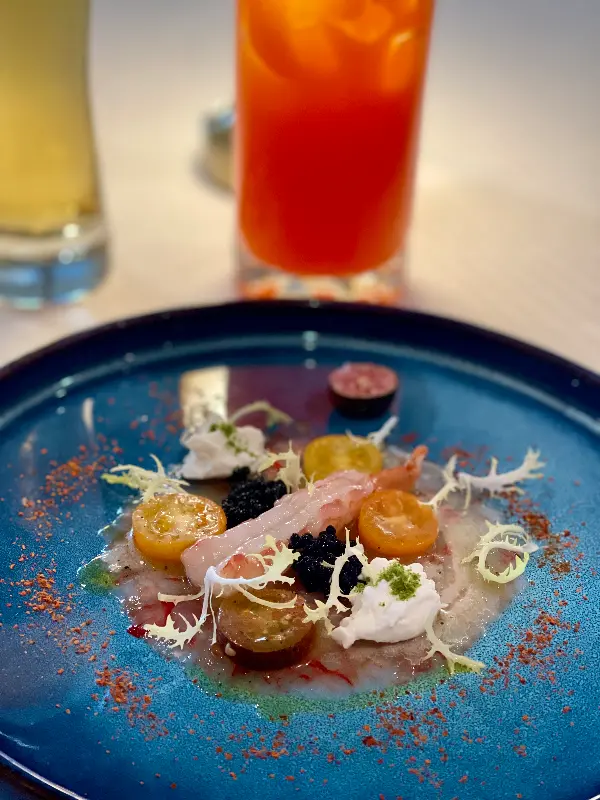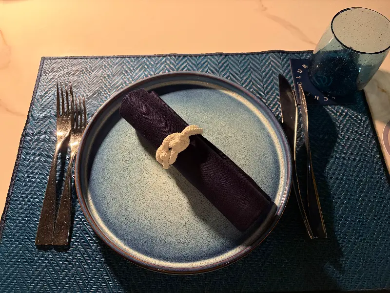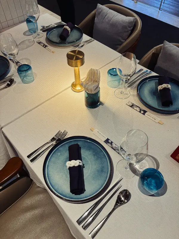 가장 먼저 눈에 띈 것은 테이블 세팅이었다. 짙은 푸른색 접시 위에는 정갈하게 말린 냅킨이 놓여 있었고, 고급스러운 커트러리가 반짝였다. 테이블마다 놓인 작은 조명 덕분에 은은하고 따뜻한 분위기가 감돌았다. 마치 특별한 날을 기념하기 위해 준비된 듯한 섬세한 세팅에 감동했다.