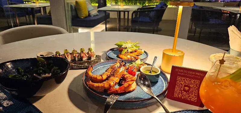 테라스 좌석에 앉아 메뉴를 살펴보았다. 다양한 해산물 요리와 스테이크, 파스타 등 다채로운 메뉴 구성에 눈이 휘둥그래졌다. 프로모션 기간이라 조금 저렴하게 먹을 수 있다는 점도 마음에 쏙 들었다. 1인 1999밧 뷔페는 정말 훌륭한 선택이었다.