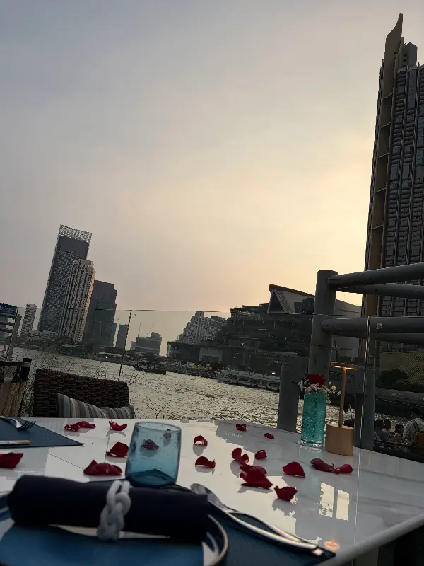 레스토랑에 들어서자 은은한 조명과 세련된 인테리어가 눈에 띄었다. 테이블 위에는 흩뿌려진 꽃잎이 로맨틱한 분위기를 더했고, 창밖으로는 짜오프라야 강의 아름다운 야경이 펼쳐졌다. 마치 세상과 동떨어진 듯한 아늑하고 고급스러운 분위기에 단번에 매료되었다. “여기서 프로포즈 받으면 무조건 승낙할 수밖에 없겠는데?” 라는 생각이 절로 들 정도였다.