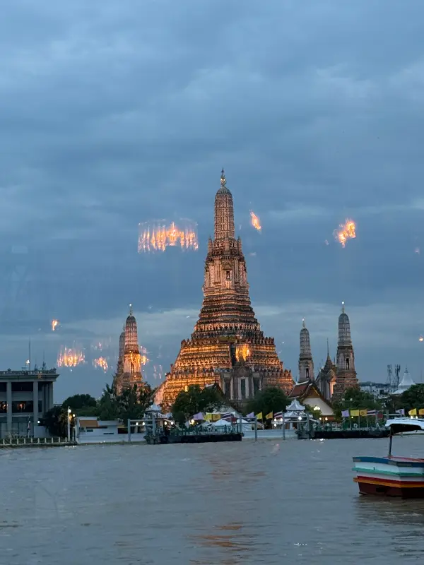 레스토랑에 들어서자마자 눈 앞에 펼쳐진 왓 아룬의 야경은 숨을 멎게 할 만큼 아름다웠다. 은은한 조명 아래 빛나는 왓 아룬은 마치 한 폭의 그림 같았다. 강가에 비치는 불빛은 잔잔하게 흔들리며 몽환적인 분위기를 자아냈다. 창가 자리에 앉아 왓 아룬을 바라보는 것만으로도 이미 절반은 성공한 듯한 느낌이었다.