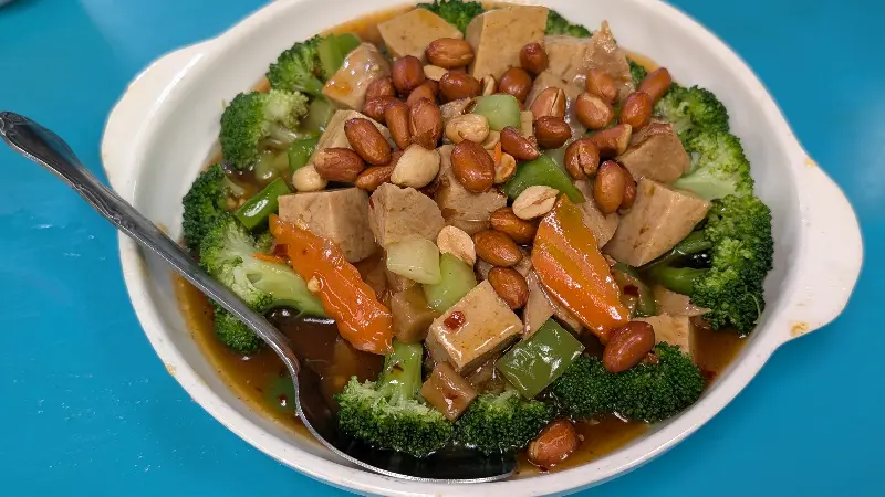 Lucky Creation의 쿵파오 치킨은 매콤달콤한 소스가 일품입니다. 채식으로 즐기는 쿵파오 치킨의 특별한 맛을 경험해보세요.