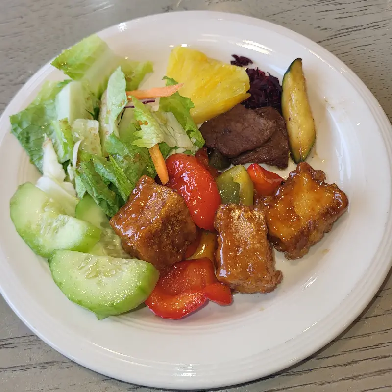 뷔페 메뉴 중에서도 특히 탕수두부는 많은 이들의 사랑을 받는 메뉴입니다. 겉은 바삭하고 속은 촉촉한 두부에 달콤새콤한 소스가 어우러져 환상적인 맛을 자랑합니다. 탕수육을 연상시키는 비주얼이지만, 콩으로 만든 두부를 사용했다는 점이 특별합니다. 매운 음식을 잘 못 먹는 사람도 부담 없이 즐길 수 있도록 맵지 않게 조리했다는 점도 VeggiEAT의 세심한 배려를 엿볼 수 있는 부분입니다.