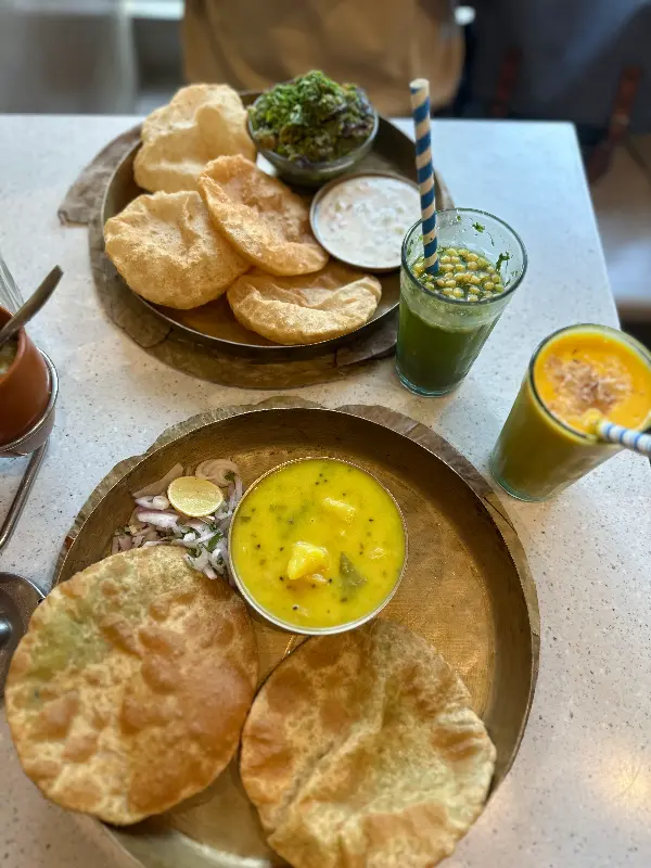 알루 다히 사브지를 곁들인 무테르 파라타는 Soam에서 맛본 또 다른 특별한 메뉴였습니다. 겉은 바삭하고 속은 촉촉한 파라타는 알루 다히 사브지와 완벽한 조화를 이루었습니다. 특히 균형 잡힌 맛과 기름지지 않은 담백함은 식사 후에도 속이 편안한 느낌을 선사했습니다. 겉은 바삭하고 속은 신선한 무테르 파티스와 향긋하고 부드러운 판키 또한 훌륭했습니다.