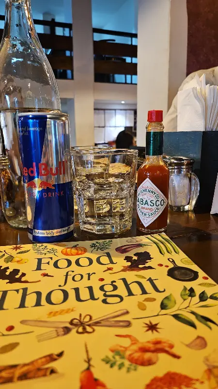 테이블 위에 놓인 ‘Food for Thought’ 문구가 적힌 테이블 매트가 인상적이다. 음료와 소스, 물병이 놓여 있고, 곧 펼쳐질 미식 경험에 대한 기대감을 높인다.