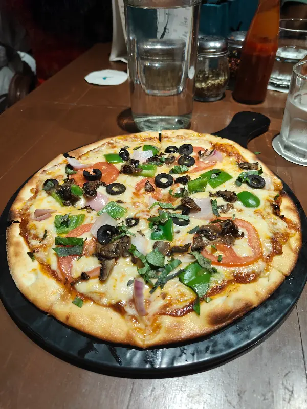 신선한 야채와 올리브가 듬뿍 올려진 스톤 오븐 가든 프레시 베지 피자는 건강하면서도 맛있는 선택이다. 다양한 색감의 야채들이 식욕을 자극한다.