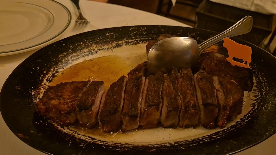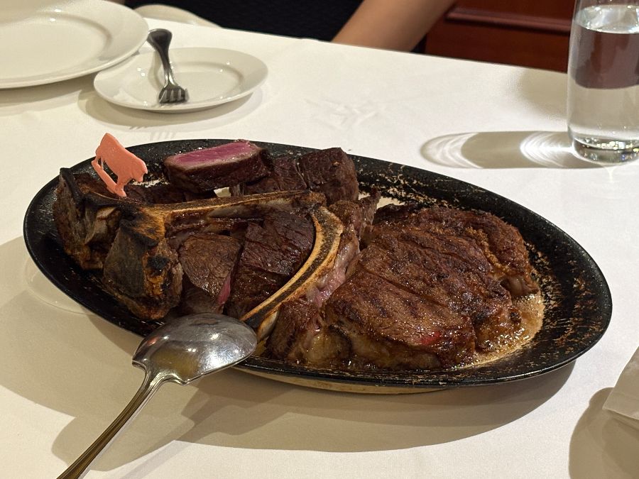 우리는 티본 스테이크로 유명한 클래식 코스를 주문했다. 가장 먼저 나온 것은 달콤하게 구운 두툼한 베이컨과 새우 샐러드였다. 짭짤하면서도 달콤한 베이컨과 신선한 새우의 조화는 입맛을 돋우기에 충분했다. 특히 베이컨은 겉은 바삭하고 속은 촉촉해서, 씹을 때마다 풍미가 입안 가득 퍼져 나갔다.