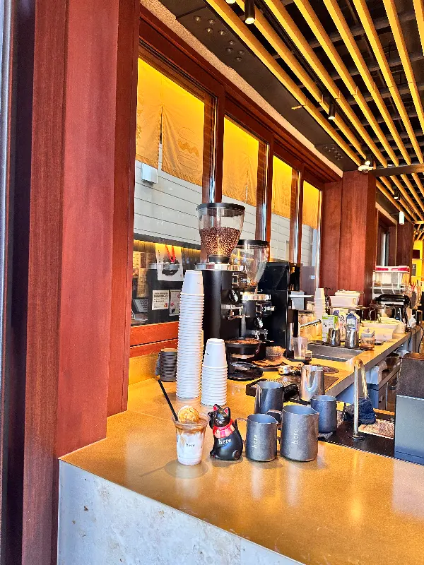 카페는 아담했지만, 오픈 바 형태로 꾸며져 있어 커피를 만드는 과정을 직접 볼 수 있었다. 창밖으로는 교토의 아름다운 풍경이 펼쳐지고, 은은하게 흐르는 음악소리가 공간을 더욱 아늑하게 감쌌다. 테이블은 몇 개 없었지만, 다행히 자리가 있어 편안하게 앉을 수 있었다.