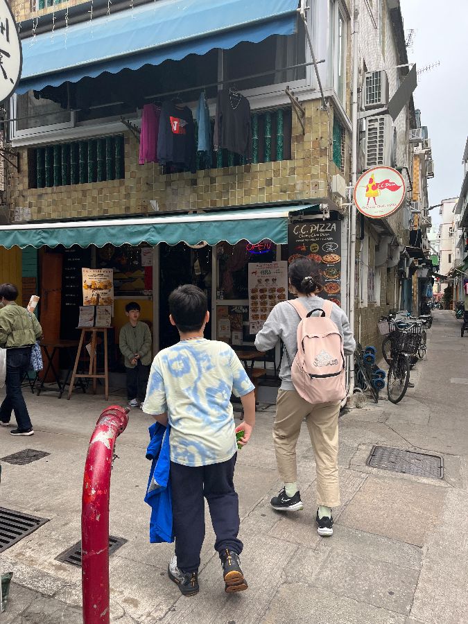 골목 어귀를 돌자, 파란색 차양이 드리워진 작은 가게가 눈에 들어왔다. 낡은 듯 정감 가는 외관, 그 앞을 지나가는 아이의 발걸음마저 그림처럼 느껴지는 곳. 바로 오늘 내가 찾아갈 청차우 섬의 숨겨진 맛집, C.C. Pizza다.