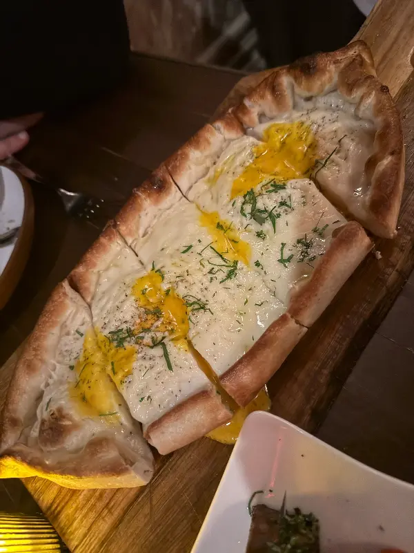 메인 요리로는 제이가 추천해준 하차푸리를 주문했다. 하차푸리는 그릴에 구운 빵 위에 치즈와 계란을 올려 만든 조지아 전통 음식인데, Anixi에서는 비건 치즈와 대체 계란을 사용하여 만든다고 했다. 비건 치즈와 대체 계란이라고는 믿기지 않을 정도로 맛이 훌륭했다. 빵은 겉은 바삭하고 속은 쫄깃했으며, 치즈는 고소하고 크리미했다. 특히, 노른자를 터뜨려 빵과 함께 먹으니 입 안 가득 풍미가 퍼져 나갔다.
