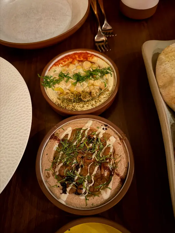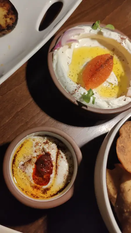 애피타이저로 갓 구운 자타르 빵과 세 가지 디핑 소스가 함께 나왔다. 병아리콩 후무스와 리코타 치즈 디핑 소스는 풍부하고 신선하며 맛이 일품이었다. 올리브 디핑 소스는 살짝 탄 맛이 났지만 전체적인 맛을 해치지는 않았다.