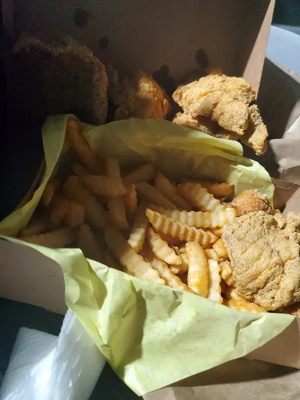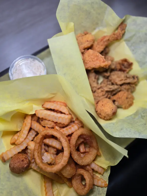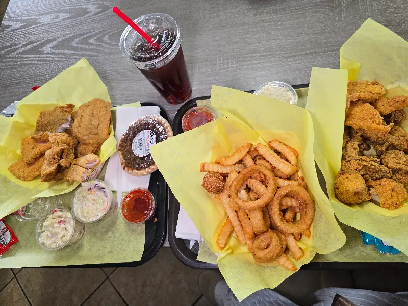 메뉴판을 펼쳐보니, 다양한 종류의 생선 요리가 눈길을 사로잡았습니다. 붉돔, 메기, 새우 등 신선한 재료들이 저를 유혹하는 듯했죠. 고민 끝에 감자튀김이 함께 나오는 메기튀김 정식을 주문하고, 허쉬퍼피도 추가했습니다. 허쉬퍼피는 언제나 옳은 선택이니까요! 아이들과 함께 방문했을 때는 #22 콤보를 주문했는데, 생선, 새우, 굴, 가리비 등 푸짐한 해산물과 코울슬로, 맥앤치즈, 감자 샐러드 같은 클래식 사이드 메뉴가 함께 나와 온 가족이 즐거운 식사를 할 수 있었습니다.