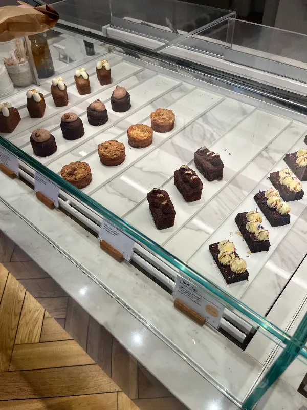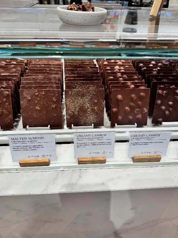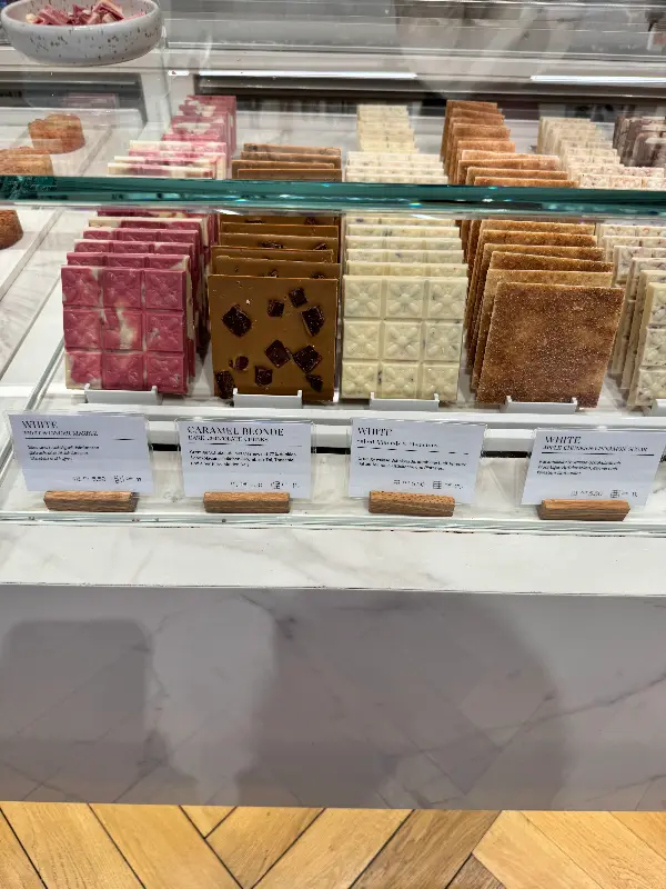 가장 먼저 눈에 띈 것은 형형색색의 비건 초콜릿 바들이었다. 깔끔한 쇼케이스 안에 정갈하게 진열된 모습이 마치 예술 작품 같았다. “White”, “Creamy Cashew” 등의 이름이 적힌 팻말이 고급스러움을 더했다.