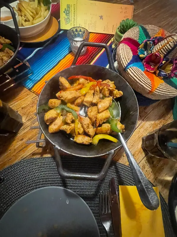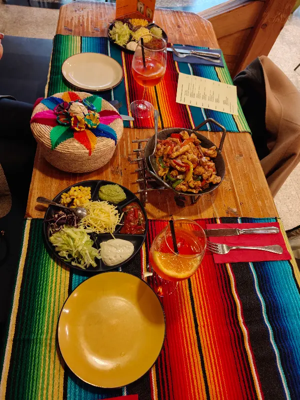 드디어 기다리고 기다리던 음식이 하나둘씩 나오기 시작했다. 가장 먼저 눈에 띈 것은 화려한 색감의 테이블보 위에 놓인 멕시코 전통 모자 모양의 바구니였다. 그 안에는 따뜻한 토르티야가 가득 담겨 있었다. 우리는 각자 주문한 요리와 함께 토르티야를 곁들여 먹으며 멕시코의 맛을 음미했다.