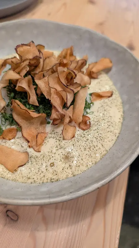 아귀 꼬치는 신선한 고추냉이 하나만으로도 입안 가득 풍미가 퍼져 나갑니다. 톡 쏘는 고추냉이의 알싸함이 아귀의 담백한 맛을 더욱 돋보이게 합니다. 감자 거품 위에 수란으로 익힌 대구와 바삭하게 구운 예루살렘 아티초크는 마치 구름 위를 걷는 듯한 부드러운 식감을 선사합니다.