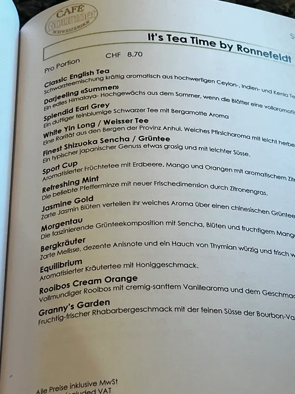 카페 구르메의 메뉴. 다양한 종류의 차와 음료를 선택할 수 있다.
