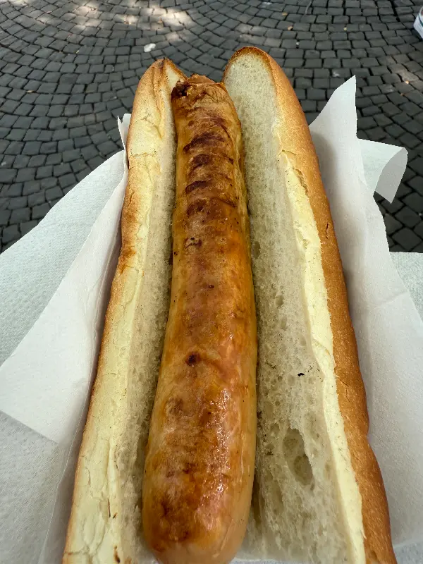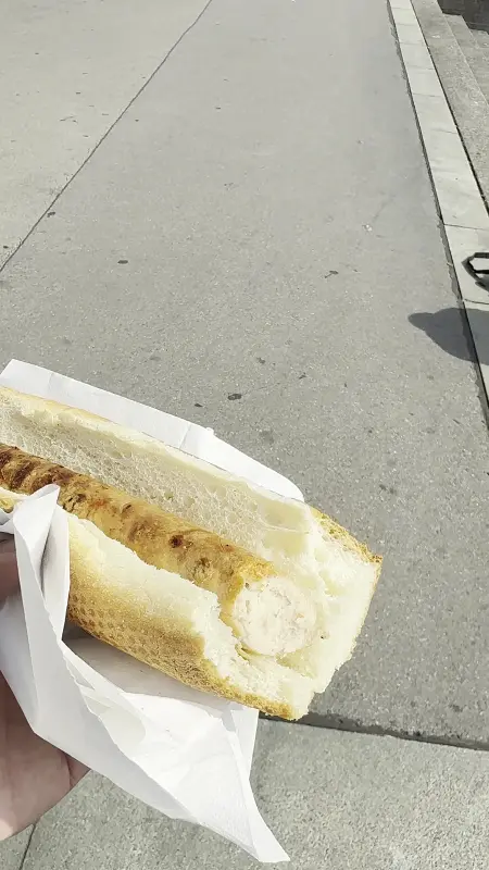 리비에라 스낵바의 대표 메뉴는 단연 부어스트입니다. 겉은 바삭하고 속은 촉촉한, 완벽하게 구워진 부어스트는 한 입 베어 무는 순간 입안 가득 풍미가 퍼져 나갑니다. 특히 전통 빵과 함께 먹으면 그 맛이 더욱 배가됩니다. 빵의 고소함과 부어스트의 짭짤함이 환상적인 조화를 이루어, 멈출 수 없는 맛을 선사합니다.