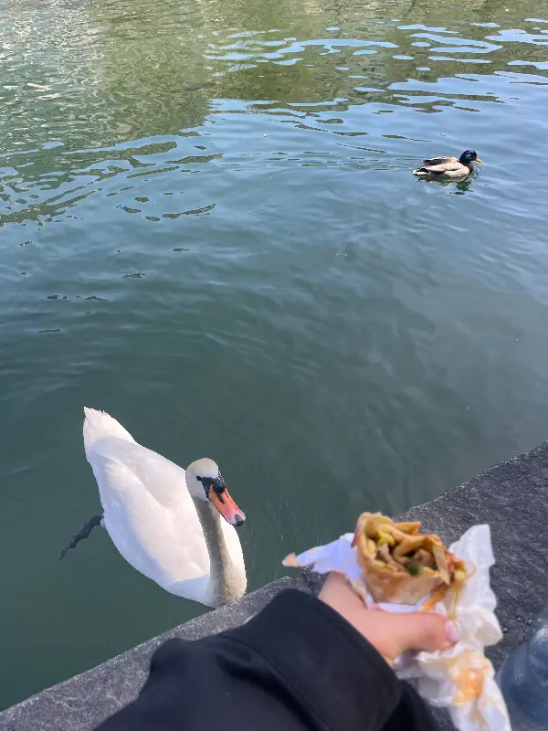 케밥을 포장해서 취리히 호숫가로 향했습니다. 맑고 푸른 호수를 바라보며 케밥을 먹는 기분은 정말 특별했습니다. 특히, 호수에서 유유자적 헤엄치는 백조와 오리들에게 케밥을 조금씩 나눠주니, 사람을 좋아하는 새들이 더욱 가까이 다가왔습니다. 마치 동화 속 한 장면 같았습니다.